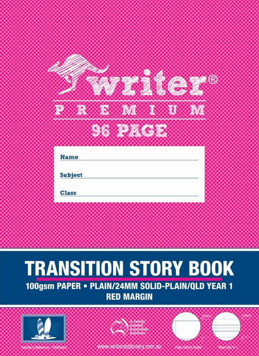 Writer Premium 96pg Transition Story Book 1/2pg Plain-1/2 pg ruled, 24mm solid, Qld Yr 1 ruled + red margin